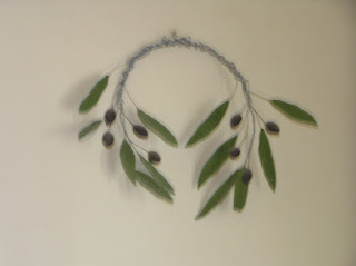 Σκέφτηκα λοιπόν τότε, ότι θάταν όμορφο να την είχα συνέχεια κοντά μου όμορφη χωρίς να την έχω στη φυλακή. Έτσι πήρα πηλό και έφτιαξα τα φύλλα και τις ελίτσες της, χρησιμοποιώντας για μοντέλο ένα κλαδάκι από πραγματική ελιά που βρίσκεται στο διπλανό στενό. Αυτή μάλιστα η ελιά, είναι στο χώρο της, με το χώμα της τον ήλιο της και όλα της τα καλά, βρίσκεται απέναντι από ένα δημοτικό σχολείο. Τεχνικά, ο κορμός είναι φτιαγμένος με σύρματα και απέξω είναι περασμένος με κομμάτια βαμβακερό πανί κολλημένο με ατλακόλ. Η βάση της είναι ένα κασπώ γεμισμένο με τσιμέντο και πέτρες για νά ναι βαριά και να την συγκρατεί. Το μπουκαλάκι του λαδιού είναι από την προηγούμενη που δεν τα κατάφερε να εγκλιματιστεί. Τα χρώματα που χρησιμοποίησα είναι ακρυλικά.